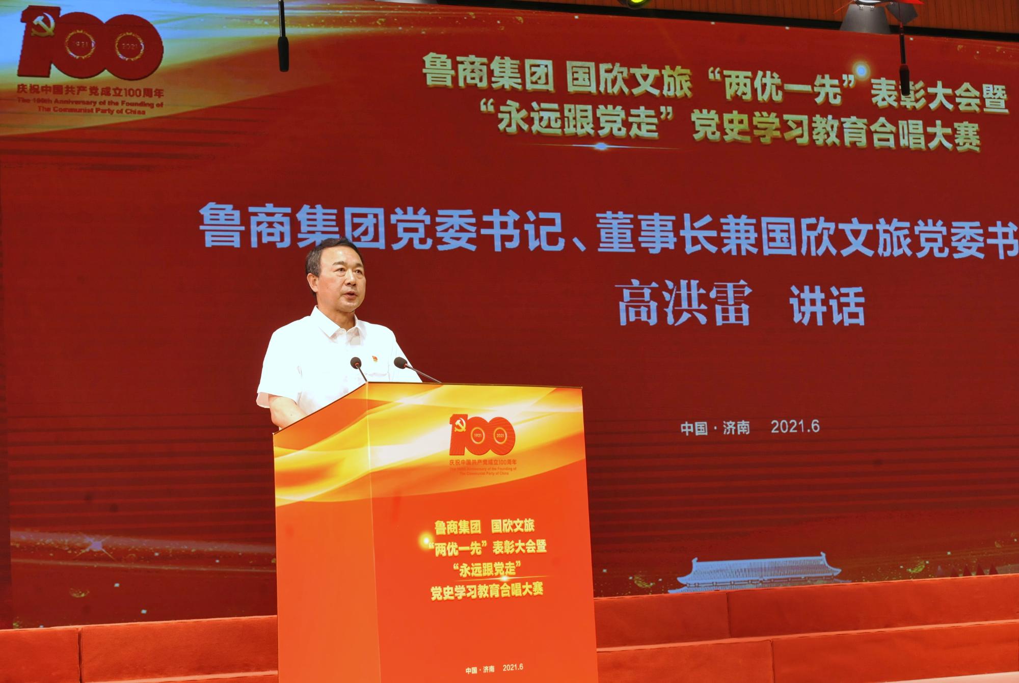為慶祝中國共產黨成立100周年,6月23日,魯商集團 “兩優一先”表彰大會暨“永遠跟黨走”黨史學習教育合唱總決賽舉行。魯商集團黨委書記、董事長兼國欣文旅黨委書記、董事長高洪雷出席活動并講話。